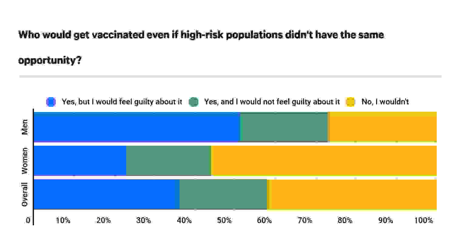 Men (51%) were more than twice as likely than women (23%) to say that they'd get the shot with the knowledge that a high-risk person might not. Twenty-two percent of men would get it and not feel bad, while just 20% of women said they would get vaccinated guilt-free.