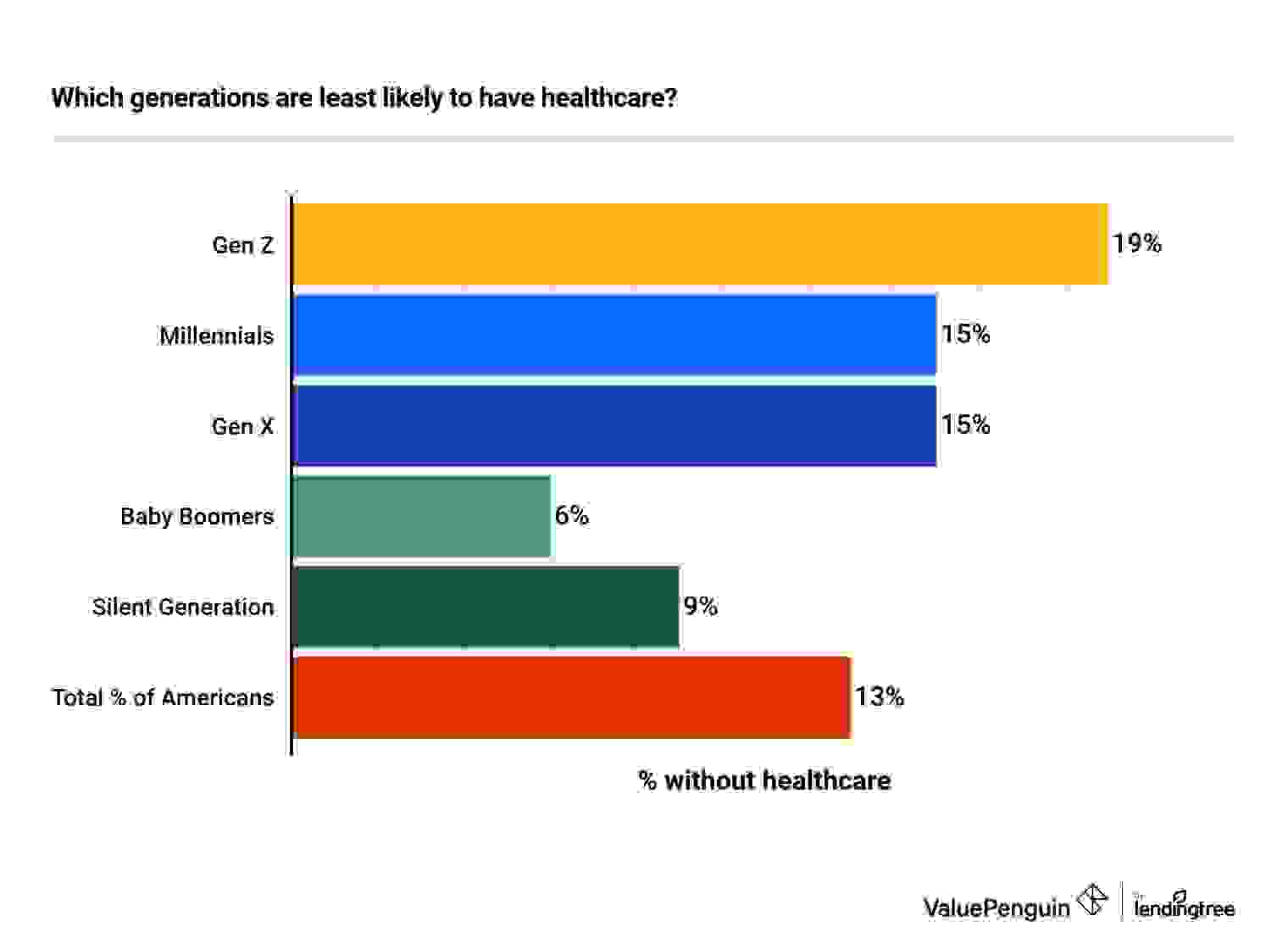 Around 13% of people don't have health insurance. Over 19% of Gen Zers aren't insured, along with 15% of millennials. When set alongside data from the Census Department, our survey suggests that the total number of uninsured Americans is rising.
